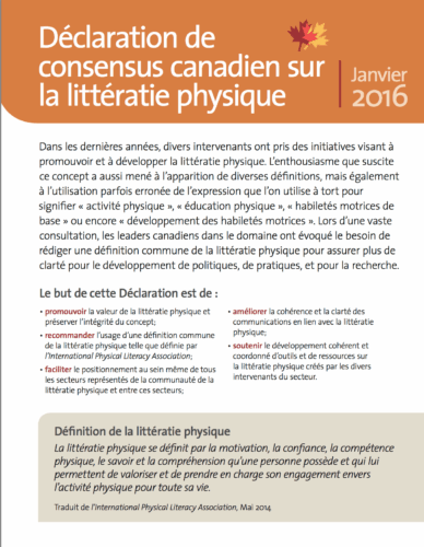 Ces dernières années, divers acteurs se sont engagés dans des activités visant à promouvoir et à développer la littératie physique. L’enthousiasme autour de ce concept a également conduit à une variété de définitions, et parfois à une utilisation inappropriée du terme en l’employant de manière interchangeable avec « activité physique », « éducation physique », « habiletés motrices fondamentales » ou « développement des habiletés motrices ». Lors d’une vaste consultation, les leaders du secteur au Canada ont suggéré qu’une définition commune avec un langage cohérent était nécessaire pour apporter de la clarté au développement des politiques, des pratiques et de la recherche.